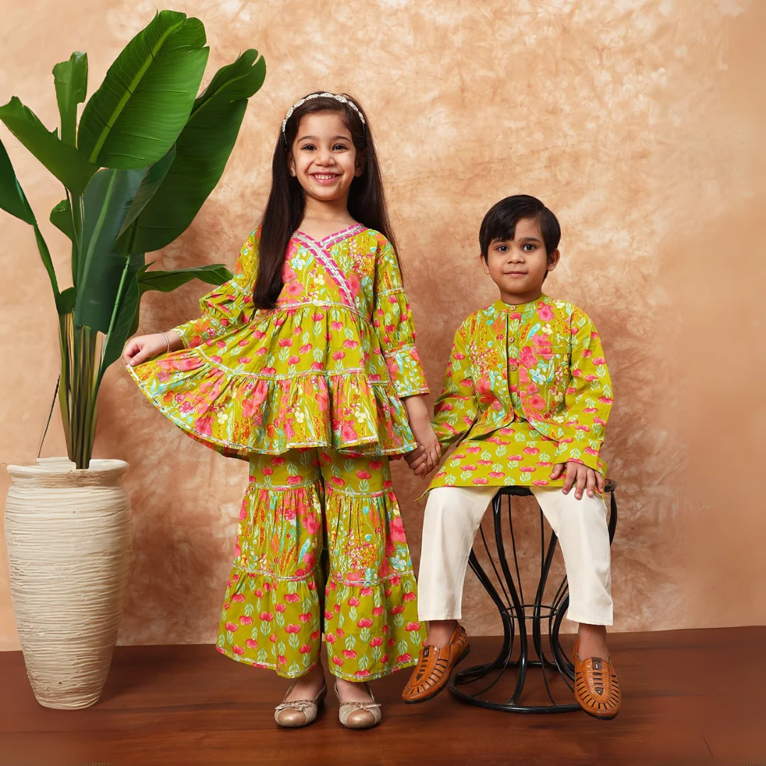 Boys Straight style Cotton fabric Green color Floral printed Kurta with attached jacket and Pyjama. A stylish and traditional outfit perfect for festive occasions.