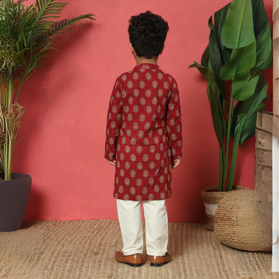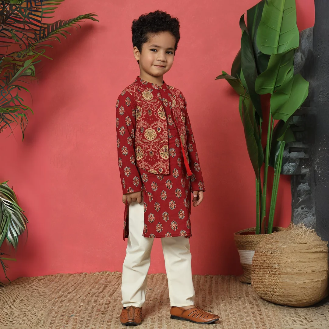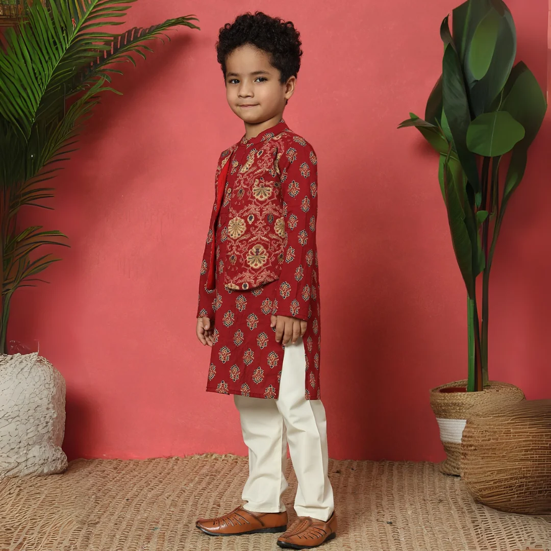 Boys Straight style Cotton fabric Maroon color Floral printed Kurta with attached jacket and Pyjama. A stylish and traditional outfit perfect for festive occasions.