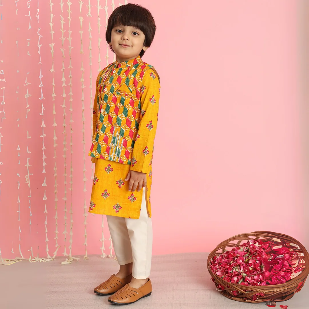 Boys Straight style Cotton fabric Orange and Cream color floral Printed Kurta and Pyjama with Nehru jacket. A stylish and comfortable traditional wear perfect for festive occasions.
