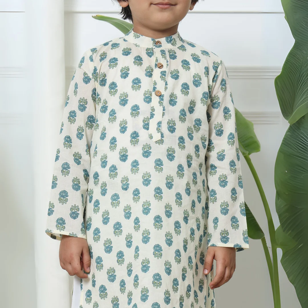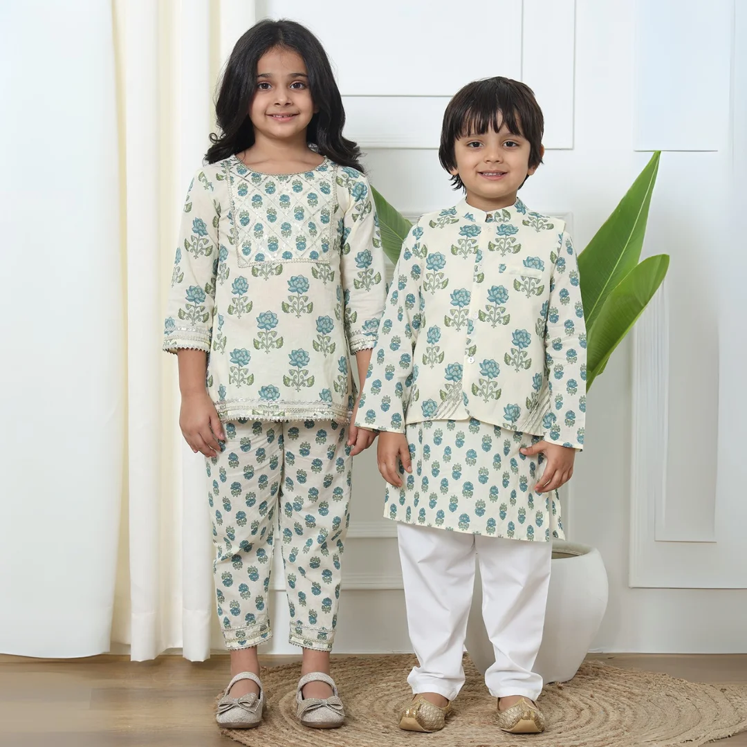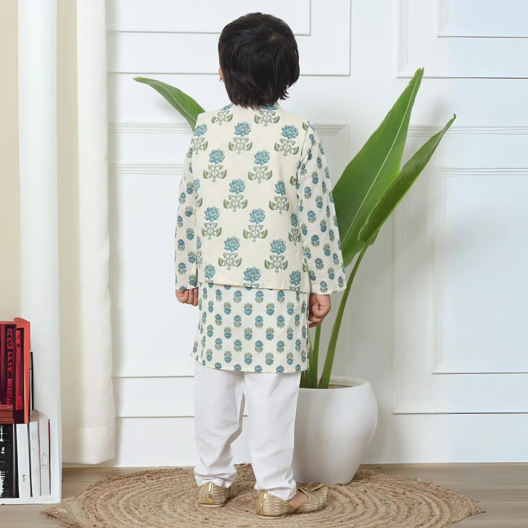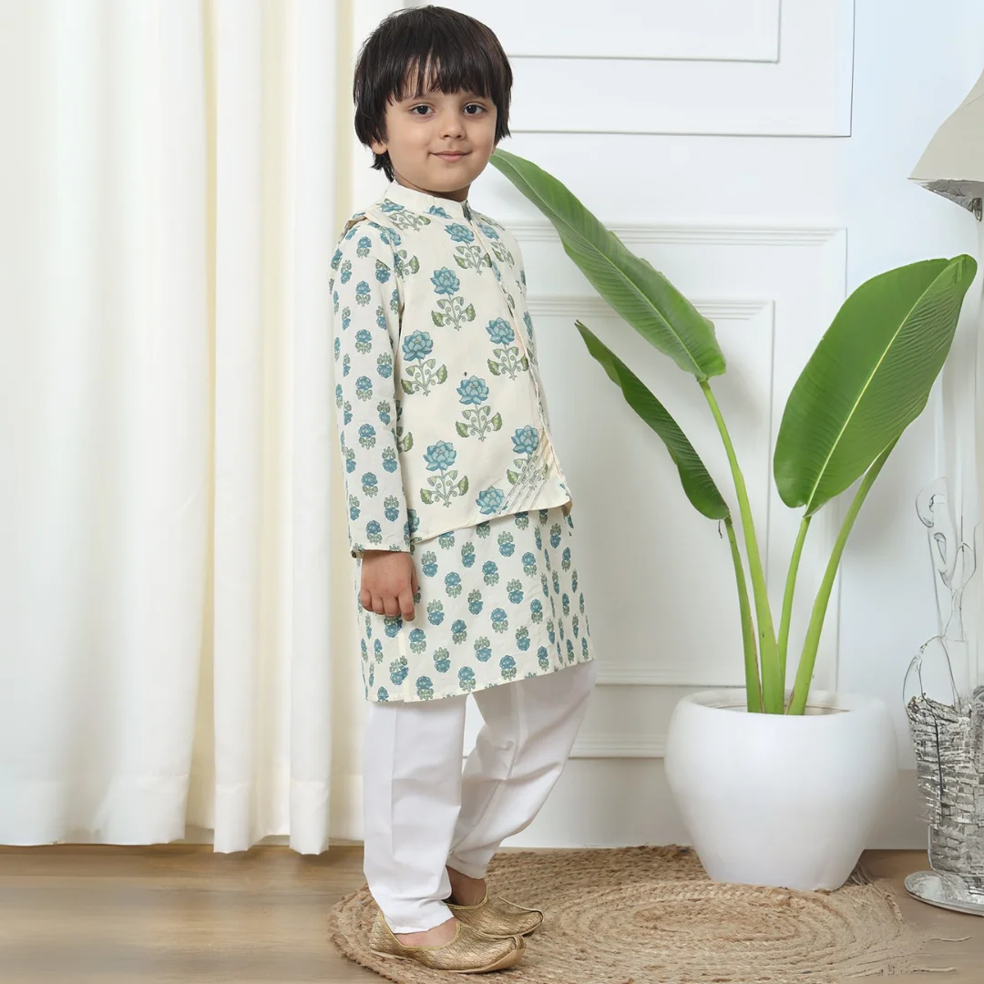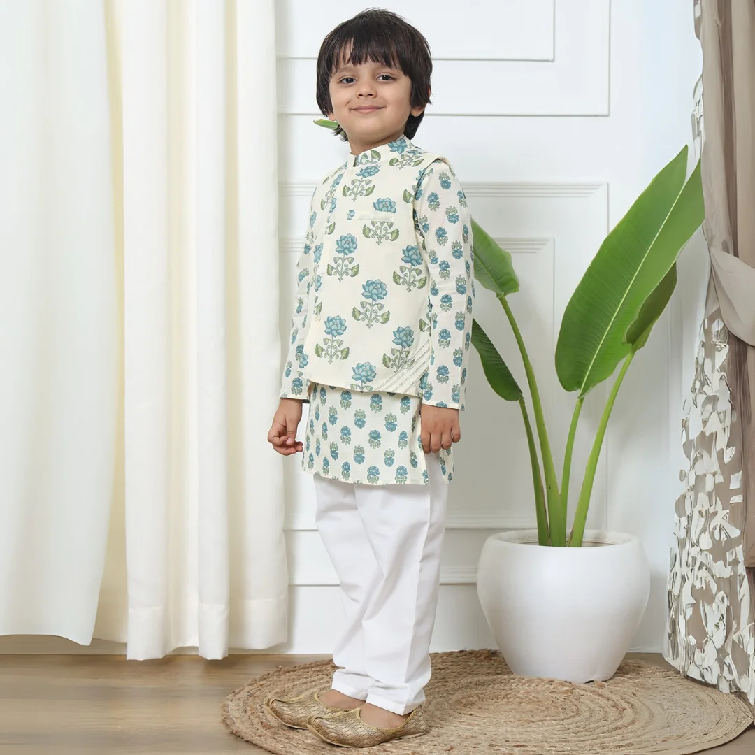 | Color | Cream Kurta with Floral Print, Matching Pyjama, and Coordinated Nehru Jacket |