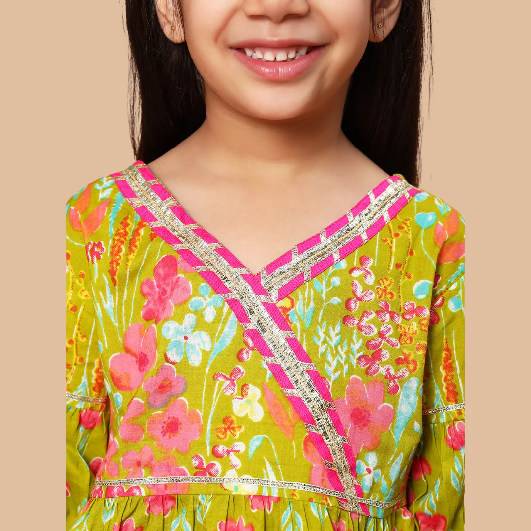 - Kurti: Frock-style with floral print and exquisite Gotta detailing.