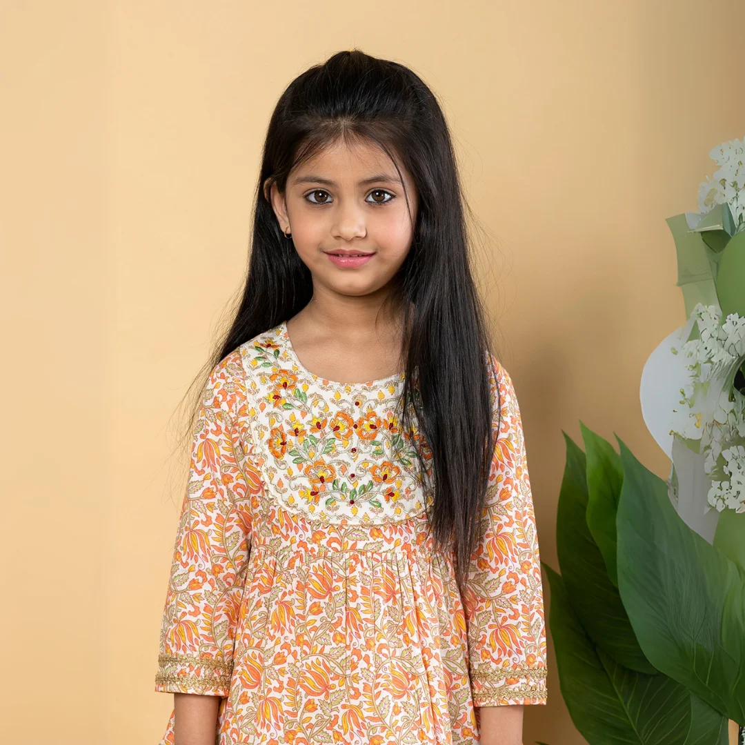 - Kurti: Frock-style with floral print and exquisite thread detailing.